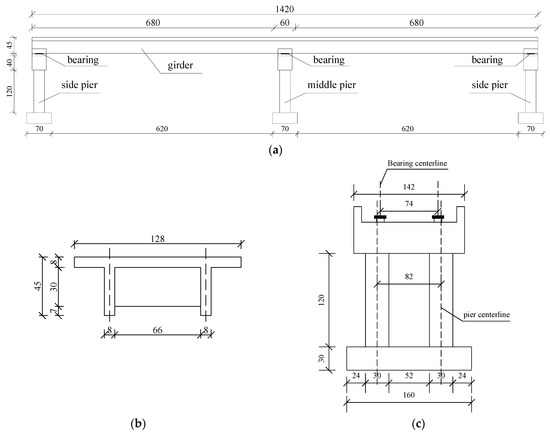 Dimensional details of bridge specimen: (a) section view of main girder, (b) section view of column, (c) pier (unit: cm).