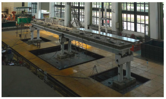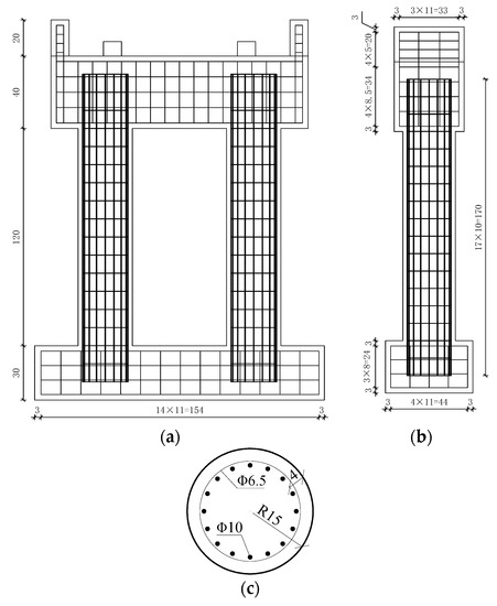 The scaled model was a two-span continuous girder bridge with a main girder length of 14.2 m (see Figure 1a). The cross section was two T-beams, and the bearing was an ordinary plate rubber bearing. The width of the T-beams was 128 cm and the height of the girder was 45 cm, as shown in Figure 1b. The substructure comprised two-column reinforced concrete piers with diameters of 30 cm. The detailed geometric arrangement and reinforcement design of the pier are shown in Figure 1c and Figure 2. The concrete strength title of the beam and pier was C30 and the compressive strength was 32 MPa. The reinforcement was HPB235 grade steel. The yield strength and the tensile strength of Φ10 bar were 351 MPa and 558 MPa, respectively. The yield strength and the tensile strength of Φ6.5 bar were 350 MPa and 531 MPa, respectively. Figure 3 shows the picture of the bridge model.