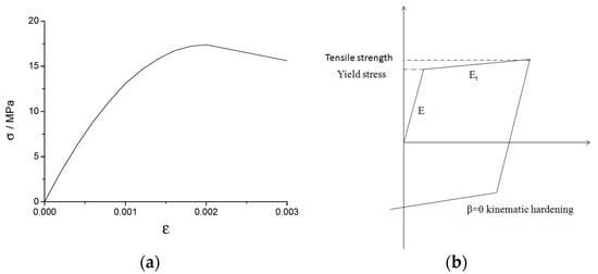 LS-DYNA software [29] was used to study the failure process of the structure. A concrete block was simulated by the solid element (solid164), and its cube compressive strength, uniaxial compressive strength, uniaxial tensile strength, and elastic modulus were 32 MPa, 17.4 MPa, 1.39 MPa, and 2.75 × 104 MPa, respectively. For the constitutive relationship of concrete, we adopted the formula in code for the design of concrete structures [30], and the descending section was subjected to the treatment method of Hongnestad, as shown in Figure 4a. The concrete material would fail when the compressive strain reached 0.0033 or the tensile stress reached 2.24 MPa. The material model number of concrete was *Mat_024 in the LS-DYNA software. The steel bar was simulated by the link element (link160). The yield strength and ultimate strength of the vertical reinforcement were 351 MPa and 558 MPa, respectively. The yield strength and ultimate strength of the stirrup were 350 MPa and 531 MPa, respectively. The elastic modulus of the steel bar (E in Figure 4b) was 2 × 105 MPa, and the tangential modulus after yield (Et in Figure 4b) was 2 × 103 MPa, which was a bilinear isotropic hardening mode, as shown in Figure 4b. The material model of *Mat_003 in LS-DYNA was used to simulate steel reinforcements. The steel bar and concrete were connected by a joint node, without considering the slip and fracture of the steel bar and the constraint effect of the steel bar on concrete.