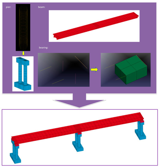 The spring element (combi165) was adopted to simulate the laminated rubber bearing. Mechanical properties of bearings were simulated by spring material model *MAT_S01. The longitudinal, transverse, and vertical stiffnesses of the side bearings were 550 kN/m, 800 kN/m, and 2 × 105 kN/m, respectively. The longitudinal, transverse, and vertical stiffnesses of the middle bearing were 955 kN/m, 1 × 103 kN/m, and 5 × 105 kN/m, respectively. When the shear stress exceeded the ultimate shear stress of bearings, the bearing was destroyed. The interaction between the pier and the girder after bearing failure was simulated by the contact mode, and the static and dynamic friction coefficients were 0.3 and 0.15, respectively. The mass element (mass166) was used in the simulation of the mass block. Each mass point was 9.3 kg; thus, the total mass was 6 tons. The specific modeling process is shown in Figure 5.