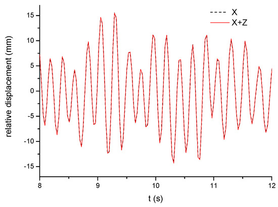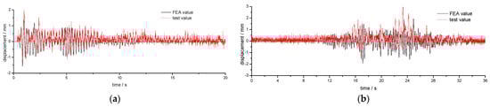 The effectiveness of the model was verified by the comparison of the test value and calculated value. Relative longitudinal displacements between the pier and the beam under two longitudinal seismic wave input conditions with a PGA of 0.05 g are illustrated in Figure 6. This shows that the calculation results of the finite element model were reliable and the calculation accuracy was acceptable.