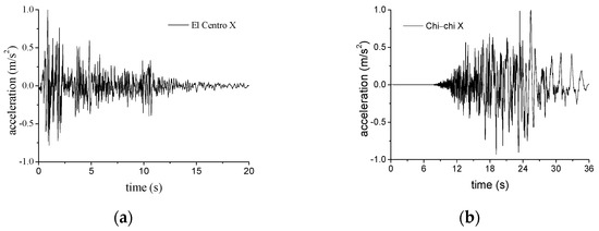 In the shaking table test, four different types of seismic waves were tested considering the influence of different site conditions, which were the Landers seismic wave, Cerro Prieto seismic wave, El Centro seismic wave, and Chi−Chi seismic wave. Two representative ground motions were selected for collapse analysis, which were the El Centro seismic wave and Chi−Chi seismic wave. Their seismological characteristics are shown in Table 3. According to the time similarity ratio, the duration of the input ground motion of the bridge model was 0.408 times that of the original ground motion. A longitudinal test seismic wave with a peak ground acceleration (PGA) of 0.05 g is depicted in Figure 7. The PGA of the seismic waves’ input in the collapse analysis rose gradually from 0.1 g until the bridge specimen collapsed.