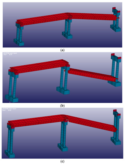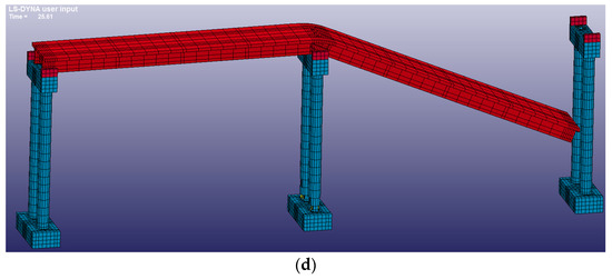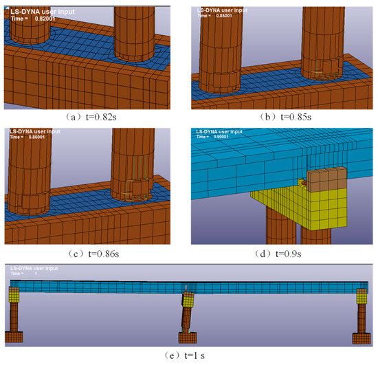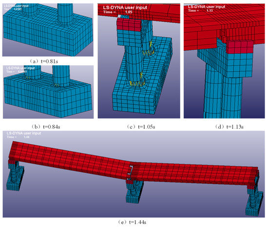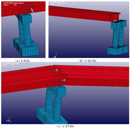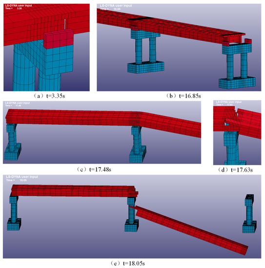 In the analysis of the 0.4 g El Centro bidirectional wave case, it could be seen that the coupling effect of vertical ground motion and horizontal ground motion was not significant. The bridge structure finally failed in the form of the collapse of the main girder due to the failure of the middle pier. The PGA was still 1.2 g, and the specific collapse process was similar to that in Figure 8.