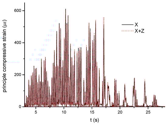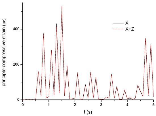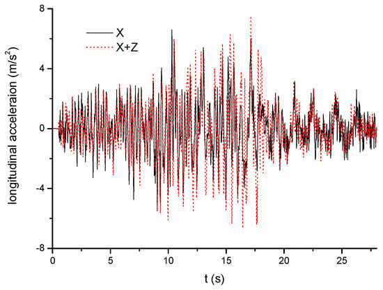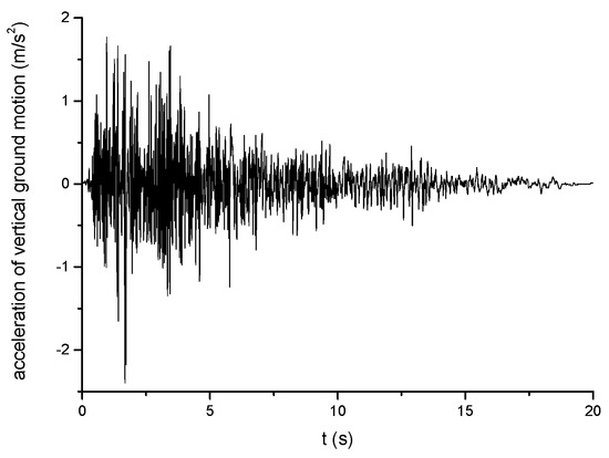 Then, the longitudinal Chi−chi wave of 0.4 g PGA was selected for analysis. The time history curve of vertical ground motion in this condition is shown in Figure 14, and the PGA was 0.32 g. After adding vertical ground motion in the longitudinal seismic condition, the response of the structure showed no obvious change. From Figure 15, the maximum longitudinal relative displacement was 15.47 mm, which was basically consistent with the value of 15.53 mm under unidirectional input. The acceleration response of the middle pier increased from 6.59 m/s2 to 7.52 m/s2 under unidirectional input, as shown in Figure 16. The response diagram of the maximum principal compressive strain at the bottom of the middle pier showed that the force of the pier column was slightly weakened, from the maximum compressive strain of 611 με to 602 με (see Figure 17).