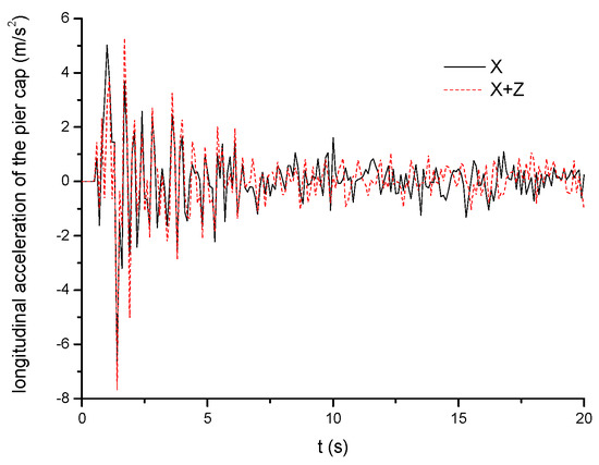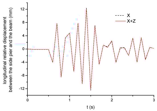 The case of the El Centro wave with a 0.4 g longitudinal PGA was selected for analysis. The time history curve of vertical ground motion in this case is shown in Figure 10, and the PGA was 0.24 g. After adding the vertical ground input, the longitudinal relative displacement between the superstructure and substructure was basically not changed. From the comparison curve of Figure 11, it can be seen that the two curves almost coincided, and the maximum longitudinal relative displacement increased from 12.14 mm to 12.45 mm. The peak acceleration response of the middle pier cap increased slightly from 6.75 m/s2 to 7.68 m/s2 under unidirectional input. The main compressive strain at the bottom of the middle pier also increased from 519 με to 531 με, as shown in Figure 12 and Figure 13.