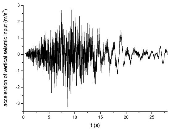 In the previous shaking table test, due to equipment constraints, only horizontal ground motion input was carried out. The numerical analysis also followed the input mode of the shaking table test in the horizontal direction, so the collapse mode obtained did not consider the influence of vertical ground motion input. However, in an actual earthquake, the input of a seismic wave imposes both vertical and horizontal loading at the same time. Therefore, the coupling effect of vertical ground motion and horizontal ground motion was considered in this paper, and the longitudinal collapse mode of a two-span continuous bridge model was analyzed. The test waves were the El Centro wave and Chi−chi wave. According to the information of original ground motion, the peak ratio of vertical ground motion and horizontal ground motion was adjusted to the peak ratio of the original wave; thus, the peak ratios of the El Centro wave and Chi-chi wave were 0.6 and 0.8, respectively.
