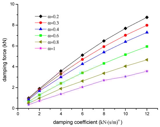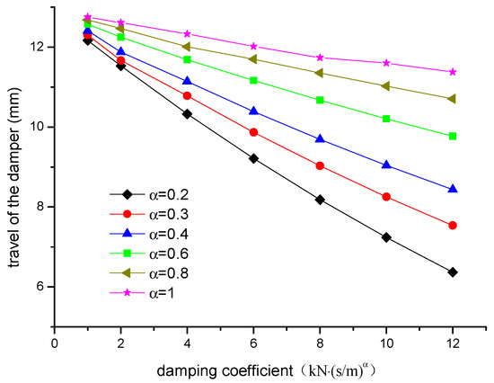 where C is the damping coefficient, v is velocity, and α is the velocity index. When the local vibration input is certain, v is the determined value and the damping force is related to the values of C and α. F increases with C. If α decreases, the hysteresis curve of the damper becomes squarer, the area increases, and the energy dissipation effect is improved. However, when α is close to 0, vα is close to 1 and the damping force is basically only related to C, which will lose the basic characteristics of the velocity correlation of the viscous damper and violate the original intention of the design. Therefore, the value of the velocity index must not be too small and is usually selected between 0.2 and 1. According to the characteristics of the research bridge in this paper, the optimization range of damper parameters is determined as shown in Table 9. The damping coefficient increases from 1 kN·(s/m)α to 12 kN·(s/m)α when the velocity index varies from 0.2 to 1. The 42 structures were subjected to El Centro seismic waves with PGA of 0.4 g. The velocity index and damping index of the damper directly affected the actual output, output rate, and maximum stroke of the damping force, as shown in Figure 21 and Figure 22.