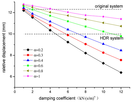 For all the conditions except scheme 1 when C = 1 kN·(s/m)α, schemes 30 and 37 when C = 2 kN·(s/m)α, and scheme 38 when C = 4 kN·(s/m), the setting of the damper increased the relative displacement between the side pier and the beam, but the increase was less than 0.5 mm. This shows that an excessively small damping coefficient is not conducive to the displacement control of the damper. With the increase of the damping coefficient, the relative displacement was gradually weakened by the damper. If the isolation effect of the HDR bearings in Section 4.5.1 is taken as the optimization goal, the number of damper design schemes can be reduced from 42 to 12, as listed in Table 10.