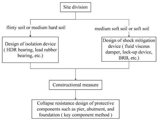 Based on the above study of influencing factors, it is suggested that the span of continuous beam bridges should be reasonably designed. In order to ensure that the structure has good anti-collapse ability, long span structures are not preferred. The height of the pier should consider the site conditions; thus, its natural period of vibration should be as far from the predominant period as possible. In the case of permitted conditions, it is recommended to choose the isolation system or the damping system. The damping system is more preferable in high-seismic-intensity areas due to the significant displacement control effect and the comprehensive performance. The anti-collapse design of continuous girder bridges could be carried out as shown in Figure 26.