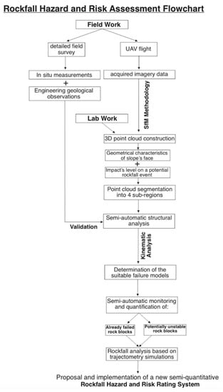 Rockfall events consist one of the most hazardous geological phenomena in mountainous landscapes, with the potential to turn catastrophic if they occur near an anthropogenic environment. Rockfall hazard and risk assessments are recognized as some of the most challenging surveys among the geoengineering society, due to the urgent need for accurate foresight of likely rockfall areas, together with their magnitude and impact. In recent decades, with the introduction of remote sensing technologies, such as Unmanned Aerial Vehicles, the construction of qualitative and quantitative analyses for rockfall events became more precise. This study primarily aims to take advantage of the UAV’s capabilities, in order to produce a detailed hazard and risk assessment via the proposition of a new semi-quantitative rating system. The area of application is located in the cultural heritage area of Kipinas Monastery in Epirus, Greece, which is characterized by the absence of pre-existing data regarding previous rockfall events. As an outcome, it was shown that the suggested methodology, with the combination of innovative remote sensing technologies with traditional engineering geological field surveys, can lead to the extraction of all the necessary quantitative data input for the proposed rating system for any natural slope.