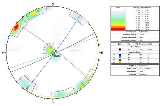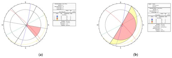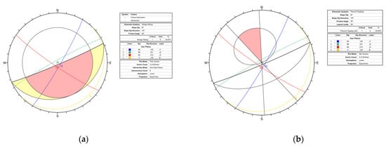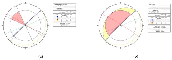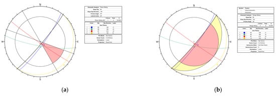 In order to determine the optimal failure model for each sub-region, a kinematic analysis was performed based on the calculated major discontinuity sets from DSE software, which were previously validated according to the field-obtained structural data [,]. This analysis was executed, for each area, via DIPS v.7 software (RocScience Inc., Toronto, ON, Canada). The geometrical characteristics of each slope and of each discontinuity set were imported, in addition to the friction angle of the bed rock, which was estimated as φ = 30°, and a stereographic projection occurred for every failure type. These produced stereonet plots, identified any potential failures and highlighted the discontinuity set(s) which contributed to those. The results of this process are demonstrated in Table 3 and the stereographic projections for each sub-region are shown in Figure 10, Figure 11, Figure 12 and Figure 13.