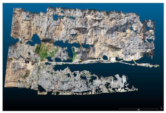 The UAV gear, via which the imagery data were collected, was a DJI Phantom 4 Pro V2.0 equipped with a 1-inch 20-megapixel sensor and an FC6310 camera of 8.8 mm focal length and a manually adjustable aperture from F2.8 to F11. A total of 362 images were acquired, in order to cover the whole slope face. The derived images from the UAV were processed using the Pix4Dmapper software v. 4.5.6. (Pix4D, Lausanne, Switzerland), resulting in a dense 3D point cloud dataset consisting of about 104 million points with a ground resolution of 1.27 cm/pixel and a reprojection error of 0.157 pixels. Further processing of the data enabled the construction of a detailed DEM (Digital Elevation Model) with the same pixel dimensions as the point cloud. The generated point cloud was georeferenced using the UAV sensor GPS data and a set of 5 artificial GCP (Ground Control Points) according to the methodology proposed by [,]. Considering the steep geometry of the slope and the relevant hazard to access higher parts, the GCP were placed in accessible lower parts across the road that leads to the monastery in some distinctive areas, as shown in Figure 3.