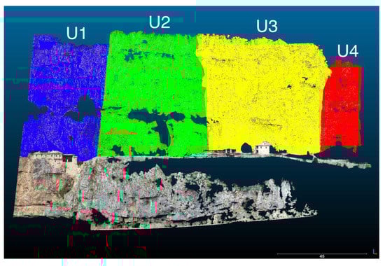 The segmented initial point cloud, in four (4) areas; U1: blue, U2: green, U3: yellow and U4: red.