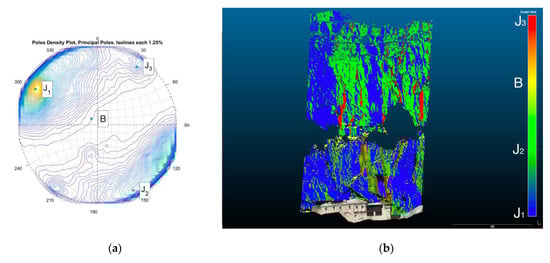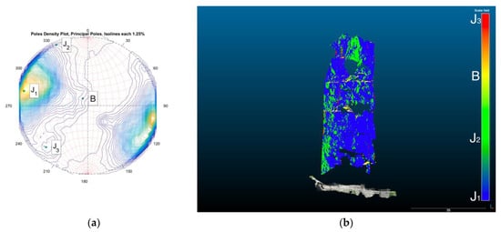 (a) Stereographic projections of the DSE-derived discontinuity sets for U2 and (b) the visual interpretation of the four (4) main sets in the 3D point cloud.