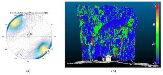 Specifically, the PCA (Principal Component Analysis) algorithm was used to calculate these normal vectors and a tolerance (n) test was performed in order to define if each set of points could be considered as a candidate of a planar area, or as non-planar and be discarded. Afterwards, in order to estimate the principal orientation, the Kernel Density Estimation [] was used. The density function was estimated automatically, and with a manual identification of the peaks of the most represented orientations, the number and the orientation of principal planes was determined. Consequently, a discontinuity set was assigned to each input point from point cloud, enabling that way the isolation of all the co-belonging points to a specific set. Then, a spatial cluster analysis was performed with the DBSCAN (Density-Based Spatial Clustering of Applications with Noise) algorithm. This resulted in clusters of points, belonging to the same set, forming plane continuous surfaces which, hence, could be considered as planes, so that the automatic calculation of planes’ equations (spacing [] and persistence []) was enabled.
