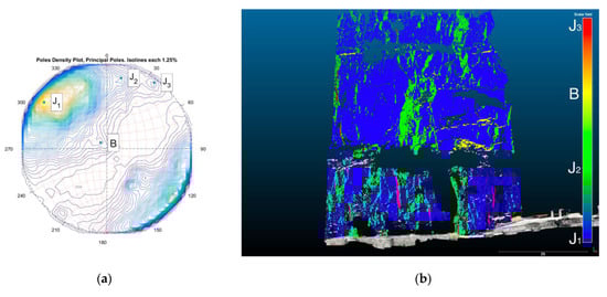 (a) Stereographic projections of the DSE-derived discontinuity sets for U1 and (b) the visual interpretation of the four (4) main sets in the 3D point cloud.
