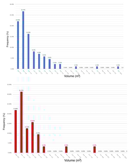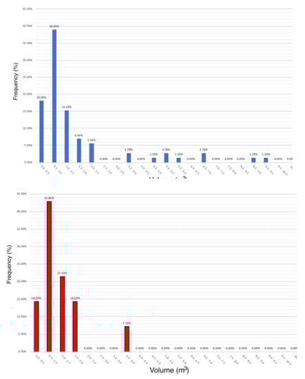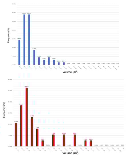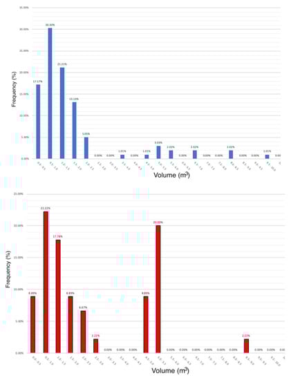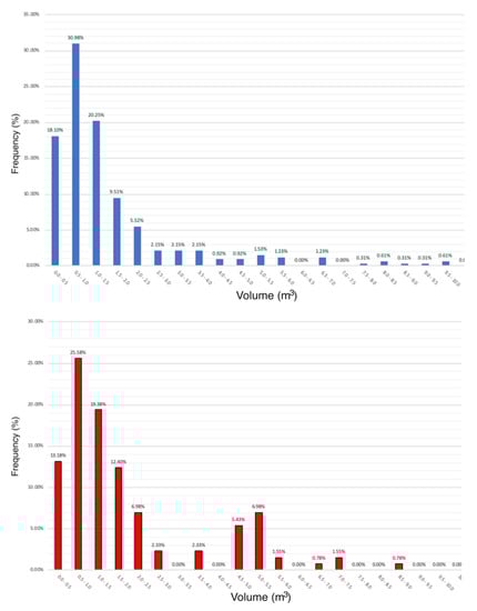 Overall, the correlation of both the spatial distribution and the estimated volumes between the already failed and the potentially unstable rock blocks seemed successful by the results of this analysis. Thus, the identification and the quantification of the potentially unstable rock blocks, which had the biggest margin of error in this particular case, appeared to be well-established. In Figure 15, Figure 16, Figure 17 and Figure 18 is shown the volume distribution (frequency %) for each investigated sub-region analytically and in Figure 19 the cumulative volume distribution for the whole investigated site.