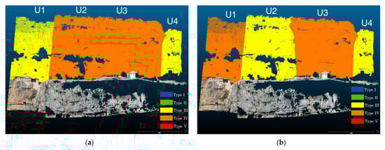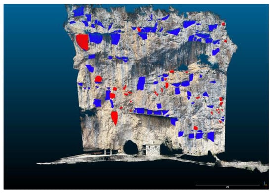 The followed methodology was based initially on the approach in [], but it was further developed to utilize the maximum of the detailed UAV-derived dataset’s capabilities. Specifically, the proposed methodology started with the processing of every sub-region’s point cloud, with the CloudCompareTM software v.2.11.1 (Anoia), in order to perform two separate semi-automated detections for the failed and the likely-to-fail rock blocks, respectively. These detections were based on the visual interpretation of the main discontinuity sets (DSE exports) and their contribution to each slope’s failure model (Kinematic Analysis exports). Hence, the geometric characteristics, the spatial distribution, the magnitude and the density of presence of each rock block were specified. Due to the lack of available rock block volumes to be analyzed, the identification and the quantification of the already failed blocks were extracted via the analysis of the fresh surfaces across each sub-region’s face slope, that attested to the existence of a prior failure. In total, 455 rock blocks were detected, 326 of them as already detached and 129 as potentially unstable. Their detailed allocation per sub-region is demonstrated in Table 4 and their visual interpretation is shown in Figure 14.