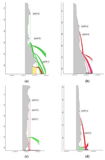 In this particular case, for sub-region U1 three (3) main rockfall release points were identified across the slope’s profile. The result of the simulation indicates that the failure from two (2) of them (point a and point b) cannot threaten the monastery, and, consequently, the rockfall risk can be neglected. The third identified release point can be harmful for the monastery and the maximum total kinetic energy of the rockfall at the location of impact with the monastery was estimated as 69 kJ. In sub-region U2, there were identified two (2) main rockfall release points that could both, potentially, produce threatening events for the road below the slope. The maximum total kinetic energy of the rockfall at the location of impact with the road was estimated to be 429 kJ for the first release point (point a) and 747 kJ for the second (point b). In the third sub-region (U3), two (2) main detachment points for rockfalls were identified as potentially harmful (point a and point b), and one (1) cannot threaten the road below (point c). The maximum total kinetic energy of the rockfall at the location of impact with the road was estimated as 3621 kJ for the first release point (point a) and 1386 kJ for the second (point b). These were the highest values for any of the investigated slopes. At last, in sub-region U4, two (2) main rockfall release points were identified. Both of them could potentially threaten the road below the slope. The maximum total kinetic energy of the rockfall at the location of impact with the road was estimated as 290 kJ for the first release point (point a) and 102 kJ for the second (point b). The detailed results from this analysis, per sub-region, are demonstrated in Table 5, while a visual interpretation of the rock blocks trajectories is presented in Figure 20.