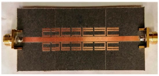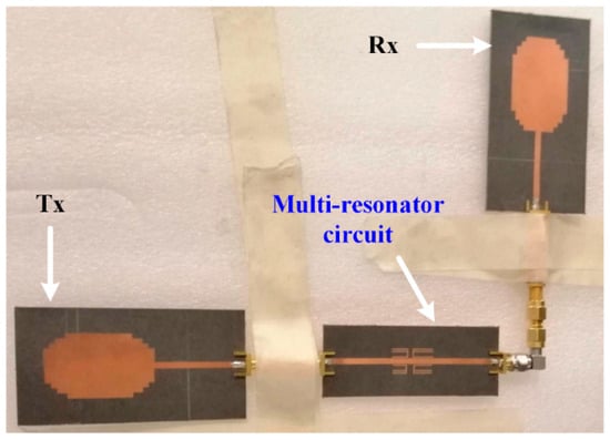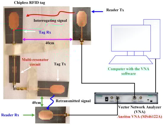 In the presented research, a measurement test bench is implemented using a vector network analyzer (VNA-MS46122A) and two sets of USRP antennas. The first set of USRP antennas connects the input–output ports of the resonator tag to act as the tag’s transmitting and receiving antennas, respectively. This is shown in Figure 10. This arrangement ensures polarization mismatch between the transmitting and receiving antennas of the tag.