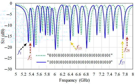 The information of each resonator can be encoded with two frequencies (f1 and f2); therefore, 28 possible frequencies can be configured, as depicted by its S-parameters in Figure 2.