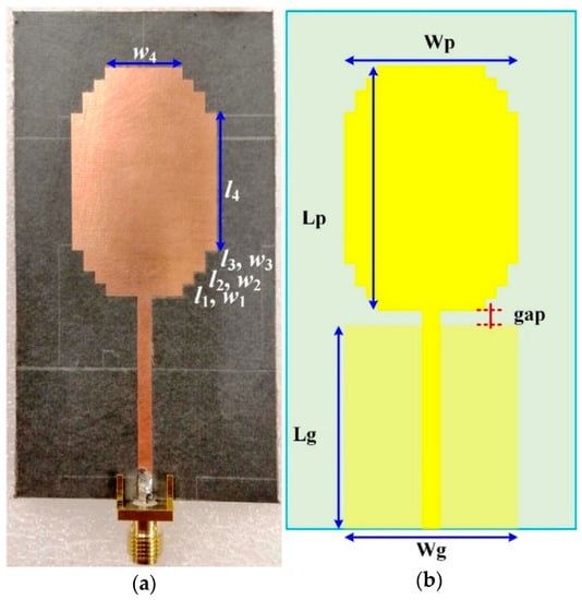 Miniaturized ultra-wideband (UWB) antennas with high gain have been an area of interest for researchers in recent years, in particular, for RFID tags applications. Various techniques have been adopted to raise the bandwidth while maintaining a good gain-to-aperture ratio []. It includes meandered ground plane antenna design [], monopole antenna with microstrip disc loading [], dual-polarized microstrip patch antenna array [], and UWB-printed circular monopole antenna []. It also includes patch antennas with gap-coupled feed [] and an integrated band-pass filter []. However, the reported techniques come with various shortcomings, which include large size, low gain, reduced bandwidth, and copolarization effects [,]. Therefore, to overcome the discrepancies in the reported techniques, we are proposing an ultra-wideband step-shape rectangular patch (USRP) antenna.