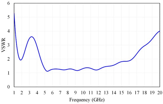 The seamless frequency operation of the USRP antenna can be examined from the VSWR graph of the antenna, as illustrated in Figure 5, which approaches an ideal value of one for a frequency range of 5–12 GHz.