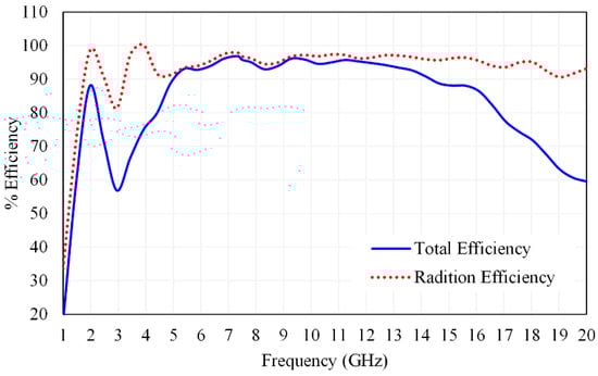 The USRP antenna achieves radiation efficiency of more than 90% over a wideband of operating frequency, as shown in Figure 7.