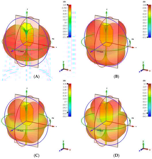 Simulated results of far field radiation pattern when the USRP antenna is operating at (A) 2.5 GHz; (B) 5 GHz; (C) 7.5 GHZ; (D) 10 GHz.