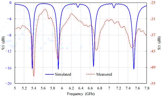 The S-parameter response (S21) is measured for the proposed RFID system. It is compared with the simulated response and shown in Figure 13. The results are both in good agreement, thus, validating the specificity of the RFID tag to be deployed in IoT networks. The slight variation occurs due to fabrication, feed line losses, and possible mutual coupling among the antenna elements.