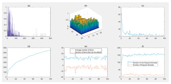 The CPU time for 100 generations of algorithm operation was 23,931 s (more than 6 h). Various results of algorithm operation are shown in Figure 2. The x axis in Figure 2a shows the number list of 468 items, and the y axis is the support of the corresponding item used as the 1-itemset. Clearly, the probability distribution of the occurrence of a single item in the transaction set was relatively uniform, and the maximum support was even close to 1. This finding indicates that this item occurs in almost every transaction, and it is the major cause of accidents if used in traffic accident association analysis.
