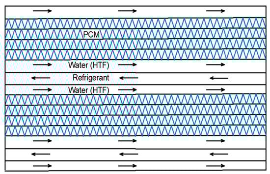The ordered channel distribution is shown in Figure 1 and was optimized according to the experimental activity described in []. The external dimensions of the LTES and the volumes of the fluids for the HEX tested are listed in Table 1. The overall number of channels is 76: 44 for the PCM, 22 for the HTF, and 10 for the refrigerant. The LTES was insulated with 20-mm-thick mineral wool.