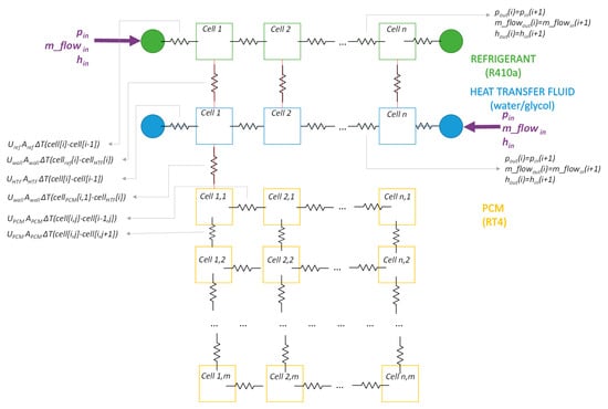 A continuity condition between cells (PCM, refrigerant, and HTF) was applied. For each i-th cell: