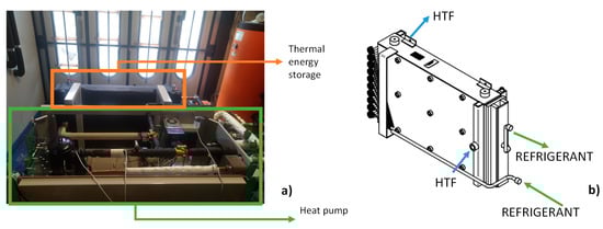 (a) heat pump and latent heat storage system installed in the lab during the testing campaign. (b) schematic representation of the three-fluid heat exchanger.