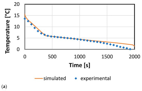 For the discharge process, a test with the PCM starting at −2 °C and ending at 12 °C, with a discharge flow rate of 0.2 kg/s for the HTF was selected. A comparison of the average PCM temperature from the experiments and the simulation is shown in Figure 4b. In this case, the average deviation between the experiments and simulation was about 16%. The larger difference being due to the larger thermal gradient in the heat exchanger, as a consequence of the turbulent flow of the HTF and its uneven distribution, which is more complex to reproduce in lumped parameter modeling. However, considering that this measurement error is in the order of 10%, the error introduced by the simulation for this operating mode can also be considered acceptable for simulation-aided design purposes.