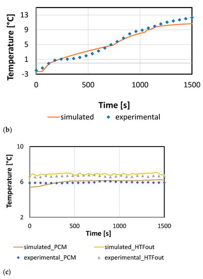 Finally, the validation for parallel operation is shown in Figure 4c. During this operating mode, as described in detail in [], the temperature of the PCM is almost constant. Therefore, for validation purposes, the temperature of the outlet of the HTF is also shown. It can be seen that the deviation between experiments and simulations is small (1 K), and it is then possible to conclude that the model developed is able to fully describe the operation of the storage under the different operating modes.