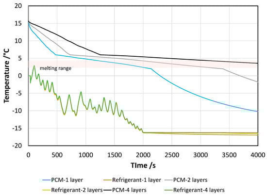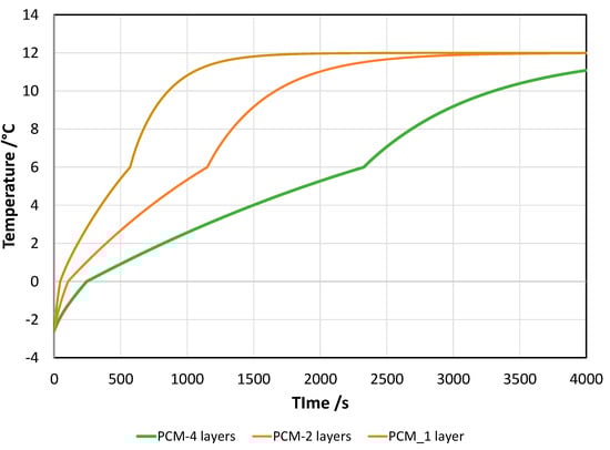 In Figure 5, the results of the parametric analysis are shown; in terms of temperatures in the refrigerant and PCM. The fluctuations in the average temperature of the refrigerant were due to the specific behavior of the heat pump tested in the lab and, more specifically, to the operation of the thermostatic valve. There is a clear difference in the temperature trend for the different cases examined; since the heat transfer for one layer of PCM is better, in the same time-span, all the material in the storage not only completes the phase change, but also sensible heat in the solid phase can be exploited, and the average temperature reached was −10 °C. For the configuration with two PCM layers, the phase change was completed after 3500 s, and a final temperature of −2.5 °C was reached. Instead, in the case of four PCM layers, after 4000 s, not all the material in the storage had completed the phase change, due to the penalization of the heat transfer induced by the low thermal conductivity of the material.