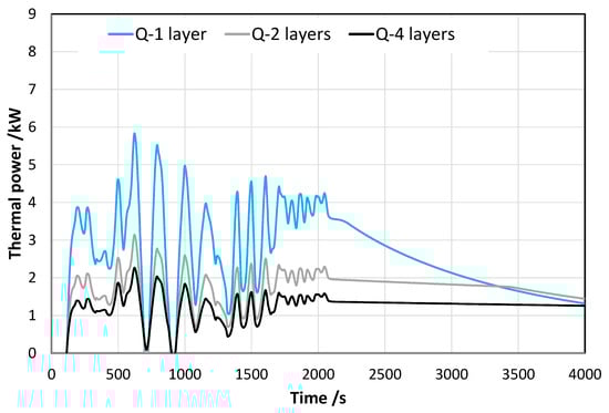The average thermal power exchanged between the refrigerant and the PCM is reported in Figure 6. For the temperature, during the first part of the charging, the fluctuations in the power are due to the fluctuations in pressure and temperature of the refrigerant, as a consequence of the opening/closing of the thermostatic expansion valve of the heat pump. It is possible to notice that the average power delivered to the user is higher for the case of one layer of PCM and decreases almost linearly with the increase in the number of PCM layers.