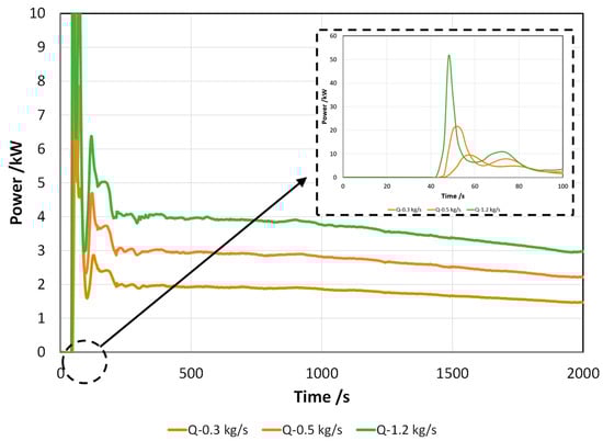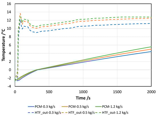 For the case of discharge, the parameters investigated were the flow rate of the HTF, which was already proven during experiments to be an important parameter in the operation of the system [], and the number of stacked PCM layers. The results, for the case of four PCM layers and a HTF inlet of 12 °C are shown in Figure 7 and Figure 8. From Figure 7, it is possible to notice that the same trend is observed for all the cases; i.e., a linear temperature increase, with a slope change when the melting process starts. What is interesting to note is that, for all the flow rates investigated, the PCM had still not completed the phase change after 2000 s, and that there was a considerable temperature difference between the PCM and the HTF. Indeed, especially for the case of 0.3 kg/s and 0.5 kg/s, already, after 1000 s the HTF outlet temperature was close to the inlet one (12 °C); thus, indicating that no useful effect can actually be supplied to the user. The average power supplied to the user is shown in Figure 8. During the first seconds, there is a peak, which increases with increasing flow rates, but already after 250 s, there is a strong decrease in the power supplied; down to values of 4 kW to 2 kW, when passing from 1.2 kg/s to 0.3 kg/s. As is common in other latent storage systems, the optimal HTF flow rate depends on the intended application [,]; if high power has to be supplied to the user, it is possible to increase the HTF flow rate, whereas to have a more constant supply for a longer time, lower HTF flow rates are needed.