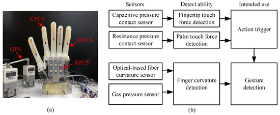 The layout and intended use of multimodal sensors are shown in Figure 1. There are four modal sensors, namely OFCS, GPS, CPCS, and RPCS. The OPCS embedded in the soft finger and the GPS integrated into the proportional valve are used to detect the curvature of each finger. The CPCS attached to the fingertip is employed to detect the touch force of each fingertip, and the RPCS attached to the palm is used to detect the touch force of the palm. The fingertip touch force detection determines the action trigger, while the finger curvature detection is used as gesture detection to verify whether the action of the SRH is correct or not.