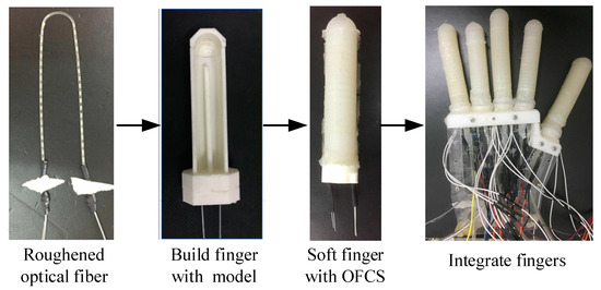Figure 2 shows the procedure of integrating the OFCS in a soft robotic hand. The optical fiber is the core component of the OFCS, which is roughened with a laser cutting machine. The silicone (Ecoflex 0030, Smooth-on, Inc., Macungie, PA, USA) is poured into a model manufactured with 3D printing technology. Then, a soft ringer with the OFCS is produced, and five fingers are integrated into a palm to form an SRH. The principle of the OFCS is based on light energy loss; the light is emitted from the gap on the roughened optical fiber when the soft finger is bent. The greater the bending degree, the more light is emitted. Therefore, the curvature of the finger is obtained by detecting the light energy loss. A detailed description can be found in [26], written by the authors of this paper.