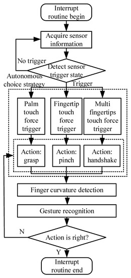 In the interrupt routine, the sensor information is firstly acquired synchronously by the ADC converter. Then, the sensor trigger state is detected, and the sensor information is continuously acquired if no trigger occurs. Once the trigger occurs, we judge which sensor induces the trigger. If palm touch force triggers, the action of grasp is launched; if fingertip touch force triggers, the action of pinch is activated; if multiple fingertip touch forces trigger, the action of handshake is started. Straight after, finger curvature is detected to verify whether the action is correct or not; if it is wrong, continue to launch the corresponding action; if it is correct, end the interrupt routine. The trigger sensor judgment and action constitute autonomous choice strategy, which is the core unit of the TDO.