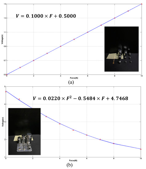 The weights are also used to calibrate the RPCS; the sensor characteristic is given in Figure 6b. The relationship between force and output voltage is given in Equation (2).