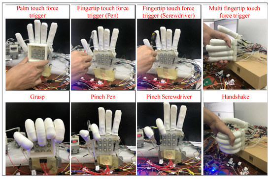 The validation experiment of TDO is shown in Figure 7, with three kinds of action being operated. The grasp action is used to grasp the plastic frame when it touches the palm and the palm touch force is triggered. The pinch action is used to grasp the roller ball pen and screwdriver when the touch force of the index fingertip is triggered. The handshake action is executed when the touch force of multiple fingertips is triggered. The experimental results show that the actions are operated exactly.