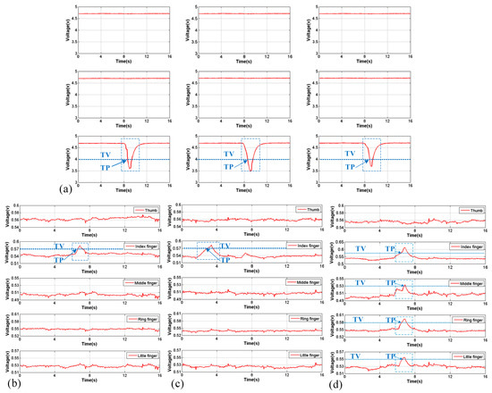 As shown in Figure 8a, the palm touch force trigger is detected when the plastic frame touches the lowest row of the RPCS, and when the voltage values of the RPCS cross the threshold values (TV) at the trigger point (TP), the trigger occurs. The RPCS includes nine of the same sensors, and the palm touch force trigger detection was judged only by the signals from the three bottom sensors, as displayed in Figure 8a. As shown in Figure 8b, the index fingertip touch force trigger is detected when the roller ball pen touches the index CPCS; when the voltage value of the index CPCS crosses the threshold value 0.57 V, the trigger occurs. As shown in Figure 8c, as the screwdriver touches the index CPCS, the voltage value of the index CPCS crosses the threshold value, and the trigger occurs. As shown in Figure 8d, the multiple fingertip touch force trigger is detected. The corresponding threshold values are index fingertip with 0.57 V, middle fingertip with 0.53 V, ring fingertip with 0.58 V, and little fingertip with 0.55 V. When a human hand touches the index, middle, ring, and little fingertips, the corresponding voltage values cross the threshold values, and the SRH executes a handshake with the human hand. The subfigures in Figure 8b–d show the voltage transformation of different fingers.