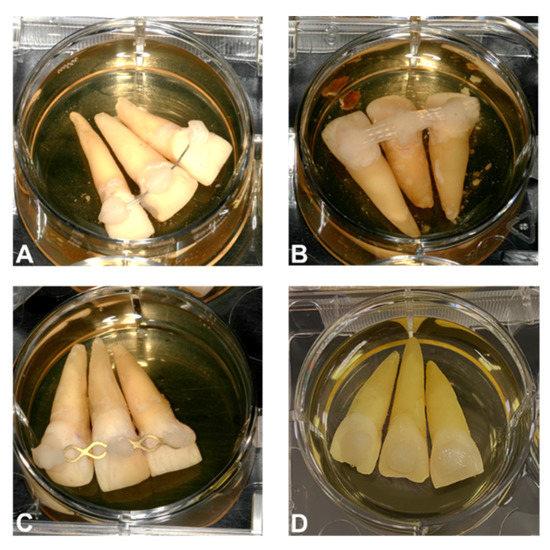Teeth groups splinted with either (A) Orthodontic wire, (B) Ribbond, (C) Titanium Trauma Splint, or (D) Monofilament fishing line. Splinted teeth submerged completely in 3 mL of peptone yeast glucose (PYG) broth and replenished equally as needed.