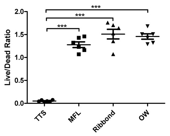 Live/dead ratio plot for the groups tested. Each group is presented by mean and standard error horizontal lines. NiTi orthodontic wire (OW), woven polyethylene ribbon (Ribbond®), Titanium Trauma Splint (TTS), and monofilament fishing line (MFL). *** p < 0.0001.