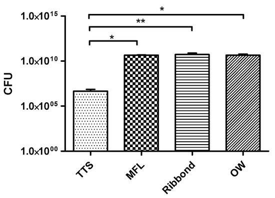Colony forming unit values (CFUs) showing the number of viable cells in each sample. MFL: monofilament fishing line, OW: NiTi orthodontic wire, Ribbond: lock-stitch woven polyethylene ribbon, TTS: Titanium Trauma Splint. * p < 0.05, ** p < 0.01.