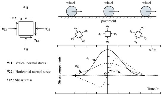 Stress components of soil element in soft subgrade induced by traffic loading.