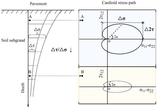 During a certain vehicle wheel passing, the changes in the stress components of the soil element in subgrade are more complex. As shown in Figure 1, the vertical cyclic stress , the horizontal cyclic stress , and the shear stress are constantly changing, and the shear stress changes both in magnitude and direction. Therefore, the principal stress axis on the soil element rotates continuously [,]. The stress path of the traffic loading in the plane can be simplified as a cardioid (see Figure 2). According to Powrie et al. [], the shear stress in subgrade decays faster with depth than the normal stresses do. Therefore, the ratio of shear stress to axial stress of the soil under traffic loading decreases with depth, i.e., the degrees of principal stress rotation in the soil at different depths are different. In recent years, some scholars have carried out a series of studies on the rotation of the principal stress axis for soft clay. However, there is comparatively little research on the deformation characteristics of soft clay.